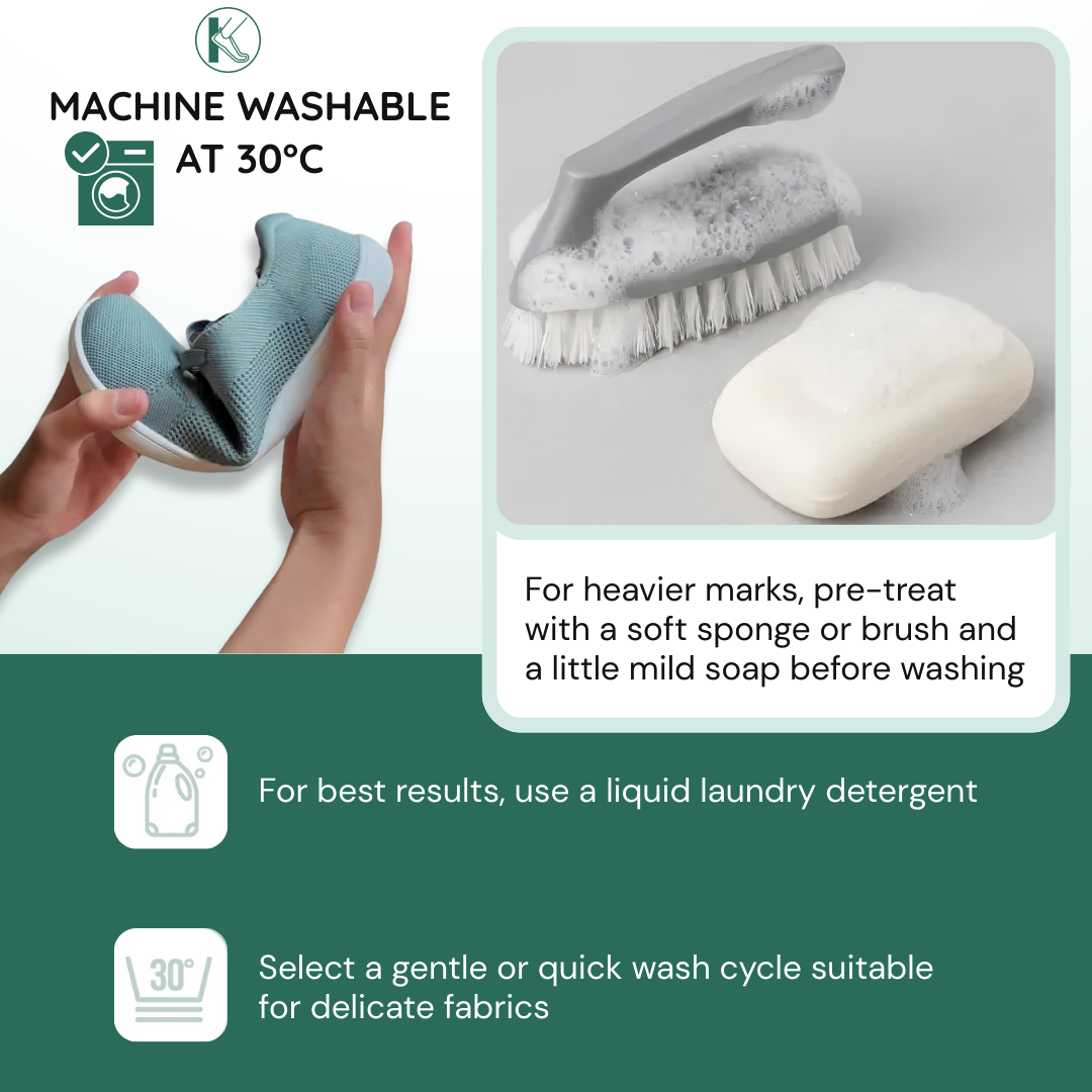 Besides, the inswalk shoes are designed for effortless care. Simply machine wash at 30°C using a liquid detergent, and select a gentle or quick cycle suitable for delicate fabrics. For any tougher marks, pre-treat lightly with mild soap and a soft sponge or brush.